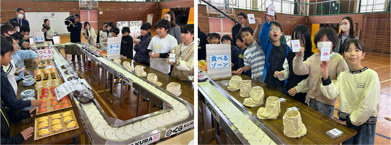 続いて、くら寿司が開発したオリジナル教材「お寿司屋さん体験ゲーム」を体験。体育館に設置された回転寿司のレーンやリアルなお寿司の食品サンプルに、子どもたちは大盛り上がりです。お寿司をつくるお店チームと、お客チームに分かれてゲームがスタート。楽しいお寿司屋さん体験ですが、実は回転寿司で起こる過剰提供や廃棄が起こることを体感するゲームです。お寿司の人気ランキングを参考に、お客さんが取る寿司ネタを予想しレーンに流しますが、予想が外れるとお寿司は廃棄されます。子どもたちは、ゲームを通じて食品ロスがどのように起こるのかを体験しました。