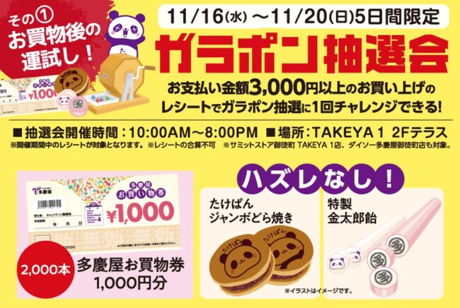 1,000円分の多慶屋のお買物券や多慶屋オリジナルキャラクター たけぱんのジャンボどら焼き、特製金太郎飴などをプレゼント!