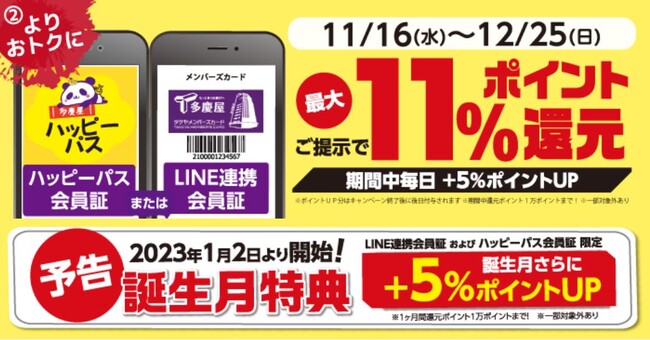 2023年1月から多慶屋会員証LINE連携済の会員やハッピーパス会員向けに「お誕生月特典サービス」が始まります。11月16日(水)~12月25日(日)期間中は新館TAKEYA1 OPENを祝し、誕生月特典を事前体験できます。
