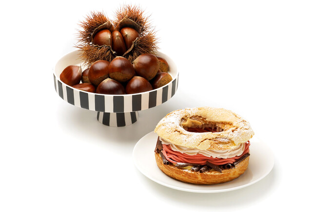 薫り高い笠間産の和栗ペーストをたっぷり使用。上質なルビーチョコレートクリームと合わせたパリブレスト。アクセントにフランボワーズの果肉をゴロゴロと忍ばせました。頬張ると芳しい和栗の風味とフランボワーズの果実味が口いっぱいに広がります。マダガスカル産カカオを使用したショコラ ノワールのコポーは、大人のビター感を演出。和栗を中心とした贅沢な味覚の共演をお愉しみいただけます。
