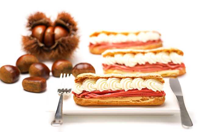 薫り高い笠間の和栗をペーストにして敷き詰めたケーキのようなエクレア。アクセントに合わせたのは優しい甘さと酸味漂うフランボワーズ。上品な甘さに仕上げたコクある和栗ペーストをフランボワーズソースとクリームでサンドしました。モンブランとエクレアを融合させた味わいをご堪能ください。