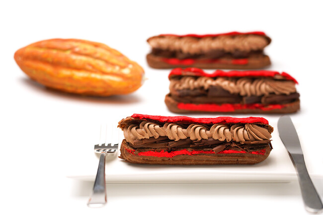 マダガスカル産カカオを使用したエクレア ショコラ。ショコラにはヴァローナ社のクーベルチュールを使用しています。赤い果実を思わせる爽やかな香りと酸味が特徴のマダガスカル産カカオは、笠間の和栗との相性がぴったり。パリパリのコポーの食感は口当たりを軽やかに。カカオの風味をご堪能いただける大人なビターな味わいに仕上げました。ケーキ エクレア マロンとのマリアージュをお愉しみください。