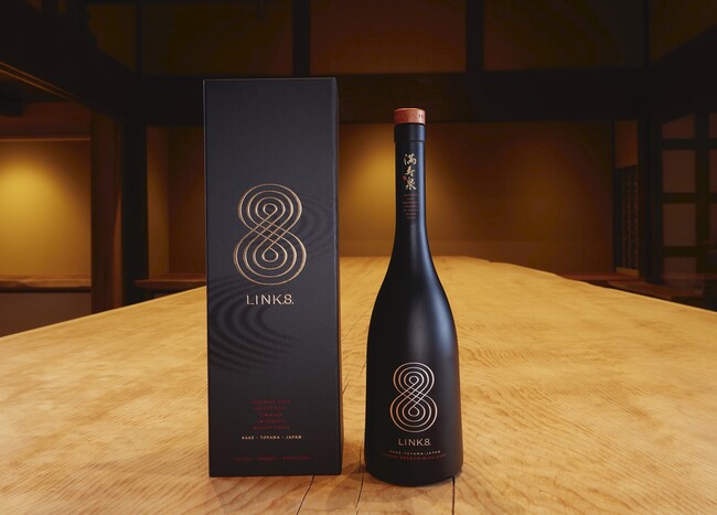 『リンク8』は、ロンドンを拠点とする著名なデザイン会社「NUDE」がデザインを手がけ、エレガントで高級感あるボトルで日本酒を新たなラグジュアリーの高みへと導きます。ボトルはヴェネチアングラスで有名なイタリアのヴェネト地方で製造しました。同じく北イタリアで製造された木製の栓は、樽熟成を象徴し、「8」のマークが刻まれています。ボトル中央を飾る「8」のデザインは、日本の禅庭の波とスコットランドの古い装飾のケルティックノットを象徴し、日本とスコットランドのつながりを表現。また、4つの「8」が重ね合わせることで、 「シーバスリーガル」のストラスアイラ蒸留所があるスコットランドのキースと、桝田酒造場のある富山市からの距離「8,888km」を表しています。