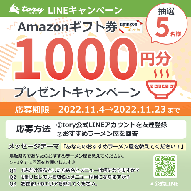 鳥取の女性向けにグルメ・イベント情報を発信するメディア「tory」(本社:鳥取県鳥取市、代表:大森誠)が、公式LINEにて11月4日よりキャンペーンを開始しました。キャンペーン詳細はこちら↓https://masa-ka.net/tory/linera-mencp202211/