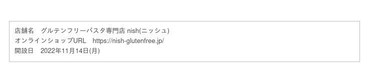 2022年11月14日(月)、株式会社ワンダーテーブル(本社:東京都新宿区西新宿 / 代表取締役社長 秋元巳智雄、以下「当社」)は、オンラインショップ「グルテンフリーパスタ専門店 nish(ニッシュ)」を開設いたしました。