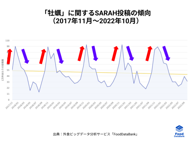 外食ビッグデータ分析サービス「FoodDataBank」から「牡蠣」についてのデータを見てみると、毎年寒い時期(12月頃がピーク)に投稿数が伸長していることが分かりました。真牡蠣や岩牡蠣など、水揚げされる種類が豊富な日本では1年を通して口にすることができる牡蠣ですが、真牡蠣のシーズンである冬の寒い時期に多く食べられる傾向にあるようです。