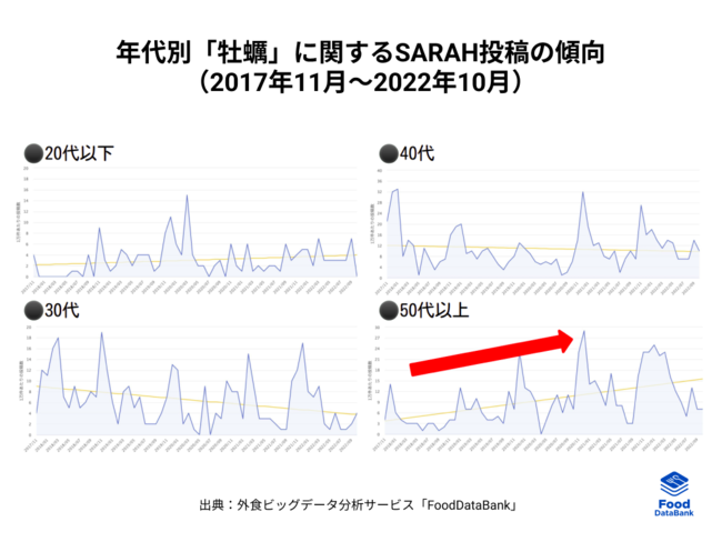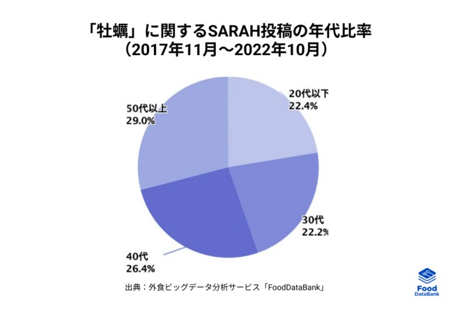 直近5年間の「牡蠣」投稿に関する年代比率(グラフ)からは、年代に大きな偏りは見られず幅広い世代に食べられていることが分かります。