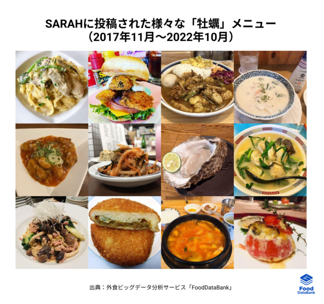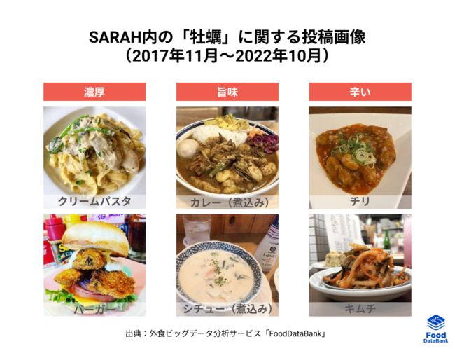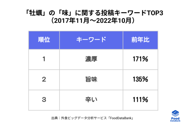 「牡蠣」とともに投稿された「味」に関する投稿キーワードTOP3(表)では、「濃厚」「旨味」「辛い」といったキーワードが前年より多く出現しており、牡蠣料理に対して消費者が注目しているポイントが分かります。