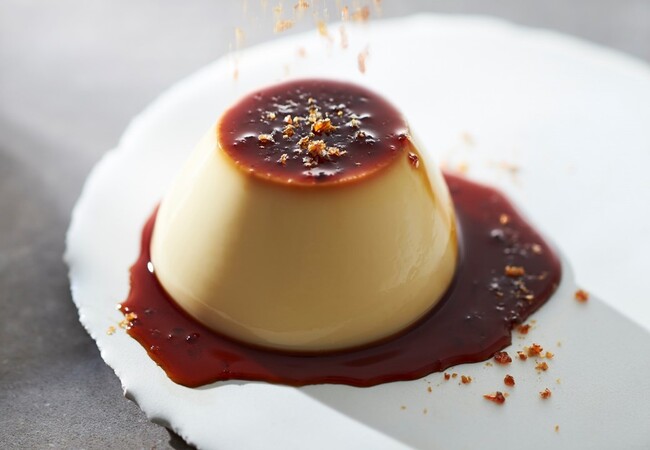 北海道産生クリームのコクが感じられる、とろける食感のプリンにすっきりとした甘さのほろ苦いカラメルソースをあわせました。香ばしくカリッとした別添の「焦がしキャラメリゼ」をふりかけることで、まるでブリュレしたかのような、贅沢で少し大人な味わいに。