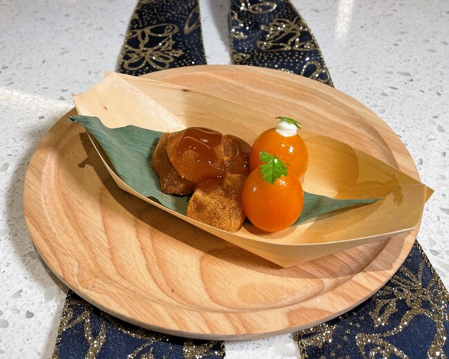 砂糖醤油の香るわらび餅と、クリームチーズの塩味をプラスした金柑の甘露煮を合わせました。