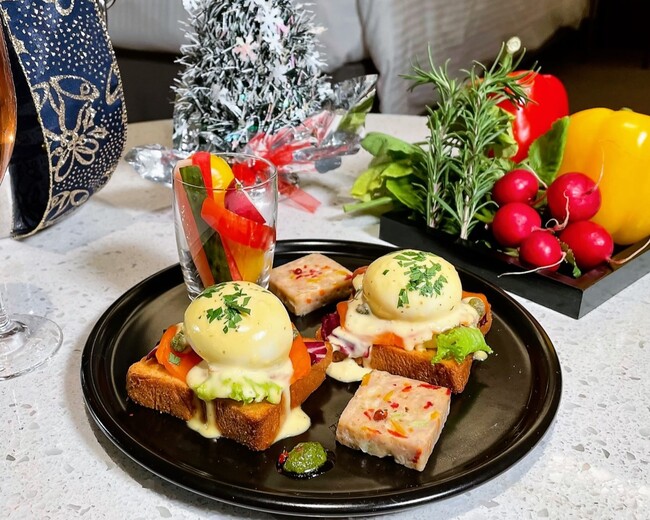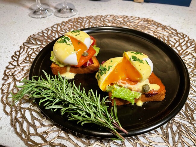 こんがりトーストしたデニッシュパンに、クリームチーズ、スモークサーモンをトッピング。半熟玉子を乗せエッグベネディクト風に仕上げたボリューミーな一品です。