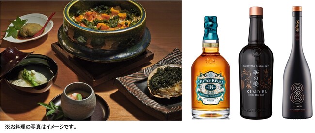 ペアリングいただくお酒は、 18年以上熟成されたブレンドを希少な日本原産ミズナラ樽でフィニッシュしたブレンデッドスコッチウイスキー「シーバスリーガル18年 ミズナラ カスク フィニッシュ」、世界に誇る京都生まれのドライジン「季の美 京都ドライジン」と「季の美 京都ドライジン」のお茶のエッセンスを引き上げた和の香り溢れる「季のTEA 京都ドライジン」、そして「シーバスリーガル」と富山の銘酒「満寿泉」の職人技の融合によって誕生したスコッチウイスキー樽熟成の日本酒「リンク8」の4種類です。