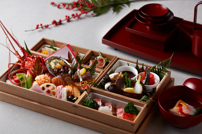 大晦日の夜にご宿泊いただくゲストの新年初のお食事として、伊勢海老やアワビ、真鯛など、縁起の良い食材を盛り込んだ1月1日限定のスペシャルなおせち朝食をご用意。「北限の柚子」としても国内外でも知られる「床井柚子園」の旬の黄柚子の香りがアクセントとなったお雑煮や、ホテル独自の配合の餌で育て上げた那須瑞穂農場黒毛和牛のローストビーフなど、新しい年の祝福にふさわしい華やかなお品書きです。