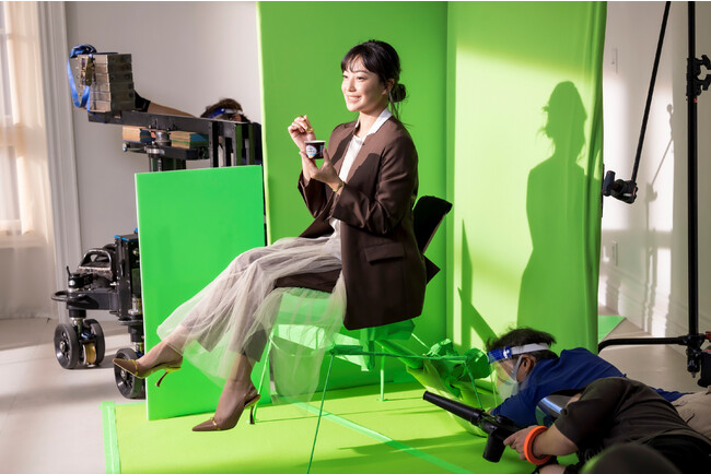 落ち着いたブラウンのシックなスーツに身を包み、撮影現場に登場した菅野さん。「レディーボーデン」を食べると感じられる“ふわ濃い”おいしさを表現するため、まず機材を使って菅野さんが浮き上がるシーンを撮影。