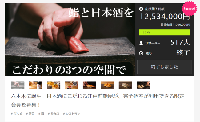 事前にコースお食事券、会員募集を実施したクラウドファンディング(Makuake)では、このモットーに共感いただけた皆様より、517件、総額12,534,000円の申込みと大反響を頂戴いたしました。