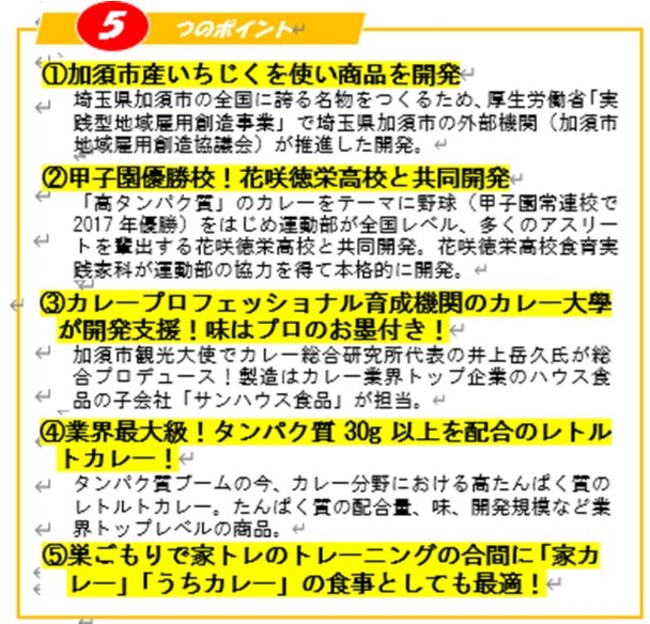 候補に挙げた遊園地など数社に打診しましたが、ビジネス的に難しいと思われて断られることが相次ぎました。けれど最終的に、最も望ましかった甲子園優勝校の花咲徳栄高校に決定することができたのが幸運でした。花咲徳栄高校はアスリートを養成するのに定評のある学校であり、食の専門家を養成する食育実践課もあるため、生徒たちとカレーを共同開発することにしました。ポイントは体を鍛える人たちの間で近年関心が高まっているタンパク質を入れ、1食で30g超の高配合にすることでした。