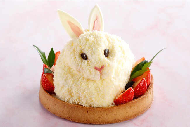 2023年の干支「卯」にちなんだスイーツは、うさぎ形のいちごのショートケーキをチーズタルトの上にのせたキュートなケーキです。スポンジ生地でふわふわの毛並みを表現し、リアルに仕上げました。