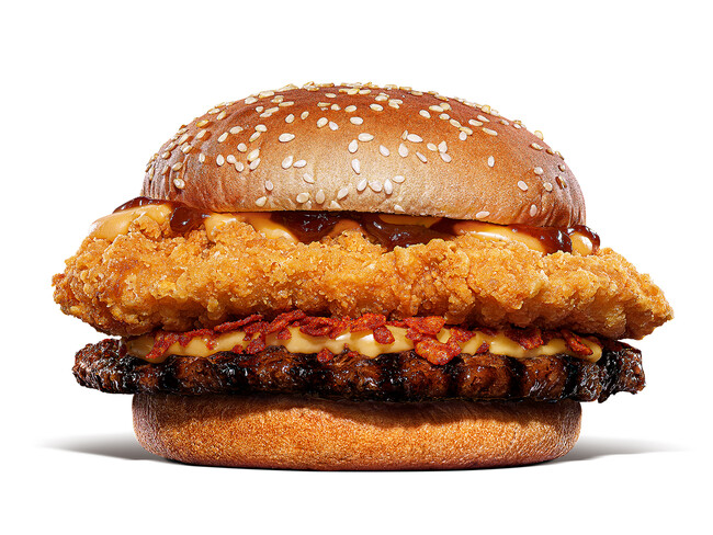 新発売の『ブッチャー・ダブルミートBBQチーズバーガー』は、バーガーキング(R) 自慢の直火焼きの100%ビーフパティに、約185g※4 の巨大鶏むね一枚肉を使用したジューシーでサクサクなチキンパティを豪快に重ねたダブルミートパティが楽しめる大型バーガーです。コク深く、渋みのあるスモーキーな「ブルズアイ™ BBQソース」と特製チーズソースに、クセになる辛さと旨味が特長の燻製辛口ガーリックフレークで仕上げました。ダブルミートのボリュームにBBQソースの旨味と刺激的な辛さをお楽しみいただけます。