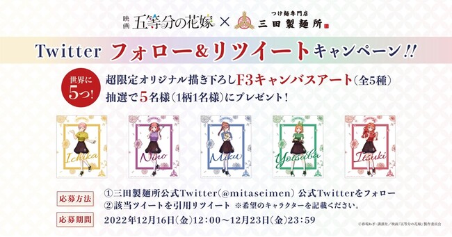 12/16(金)から7日間、三田製麺所公式Twitterにて開催のTwitterフォロー&RTキャンペーンでは、描き下ろしF3キャンバスアートを抽選で5名様(1柄につき、1名様)にプレゼント致します。ご希望のキャラクターの名前を記載の上、挙ってご応募くださいませ。