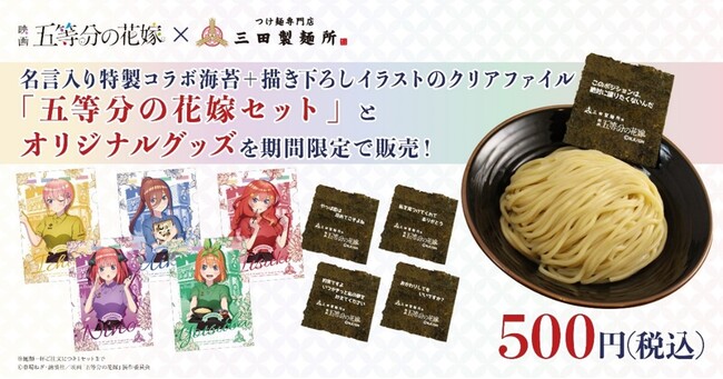 2022年12月1日(木)より、株式会社エムピーキッチン(本社:東京都渋谷区、代表取締役:村上竹彦)が運営する「つけ麺専門店 三田製麺所」は、映画「五等分の花嫁」とのコラボキャンペーンを全国11店舗で開催致します。作中の名言をプリントした特製コラボ海苔と、描き下ろしイラストを用いたクリアファイルの「五等分の花嫁セット」((税込500円)をはじめ、複数のコラボ商品を数量限定で販売致します。また、ヨドバシAkiba店・なんばCITY店では五つ子の等身大キャラクターパネルを、中野店では大型タペストリーを特別展示します。