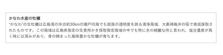 提供牡蠣:かなわ水産の「先端(SENTAN)」、「ひろしま」、「大黒神島」