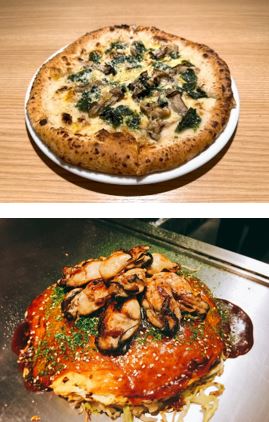 江田島の山岡水産の新鮮な牡蠣を桜のチップで燻製し、旨味と香ばしさ、生青海苔で海を感じていただけるようなピッツァに仕上げました。