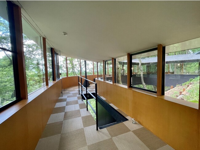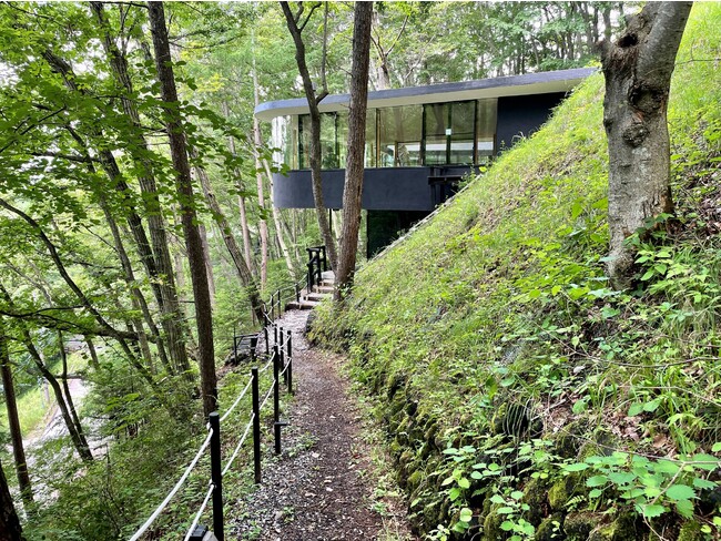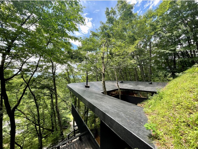 崖に差し込まれるように建てられた回廊型の建物は、展望台のように絶景を愉しむことのできる森に浮かんだリビングと、洞窟のように静かで落ち着いたベットルームがフラットな床でつながり、どこまでも回遊できます。また、ちょうど崖の斜面に沿うように置かれた湯船に浸かれば、まるで地面と一体になったかのような開放的な気分を味わえます。崖に差し込まれる外観は個性的で、ドラマ「ガリレオ」(2013)の撮影で使用されました。
