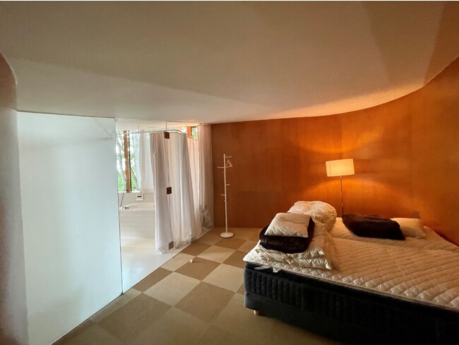 個性的な回廊型のワンルームスタイルは、建物内のどこにいても、家族の姿が見渡せます。マスターベッドルームとバスルームの仕切りはガラスで、視線を遮りません。