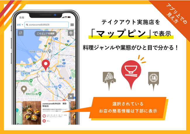 検索すると、comecomeBURGERの店舗やキッチンカーがマップピンで表示されます。