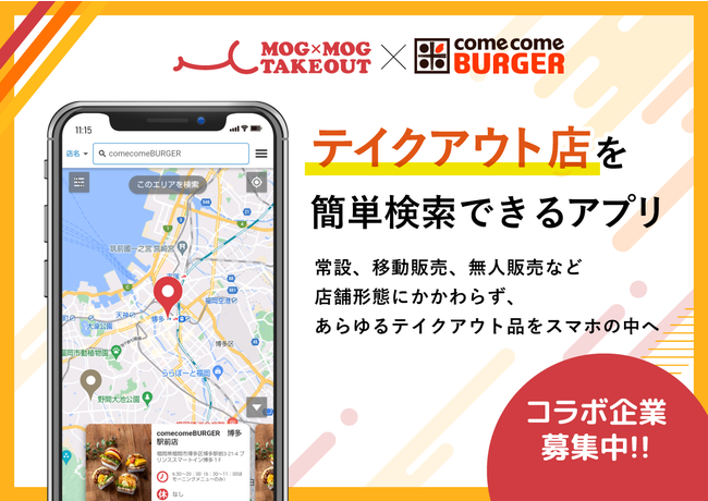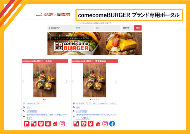 株式会社ジールプロダクト(本社:福岡市中央区、代表取締役:林田 浩幸)が運営する、テイクアウトPRサービス「モグモグテイクアウト」は、株式会社COME COME BURGER(本社:福岡市中央区、代表取締役:別府 崇)が運営する、お米バーガー専門店「comecomeBURGER」のブランド専用ポータルを11月17日にリリースいたします。順次掲載店舗追加予定です。テイクアウトのPRに加え、ブランド専用ポータルでは、店舗一覧表示、独自エリア絞込機能を利用することでブランドPRも実現いたします。