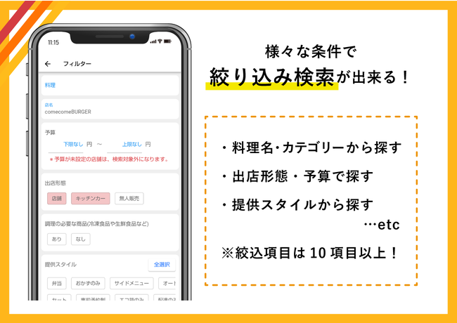 その他にも出店形態、提供スタイル、カテゴリーなど様々な条件で絞り込み検索することができます。