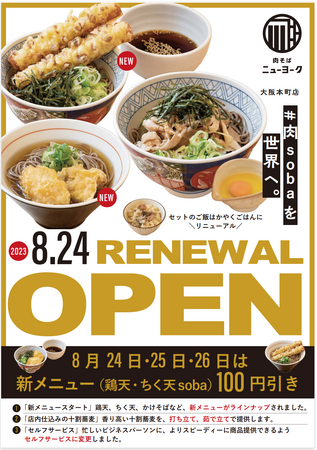 また、リニューアルを記念して、8月24日から26日までの3日間、新メニュー「鶏天soba」と「ちく天soba」が100円引きで販売されます。この機会をお見逃しなく。