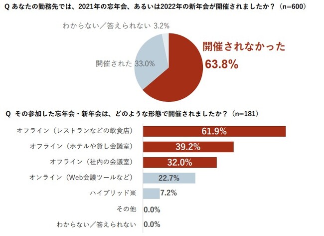 新型コロナウイルスの世界的な流行以来、忘年会・新年会などの集合型のイベントの開催が難しい状況が続いてまいりました。本調査においても、前年の忘年会(2021年末)及び新年会(2022年初)を開催していない企業は全体の60%を超えています。