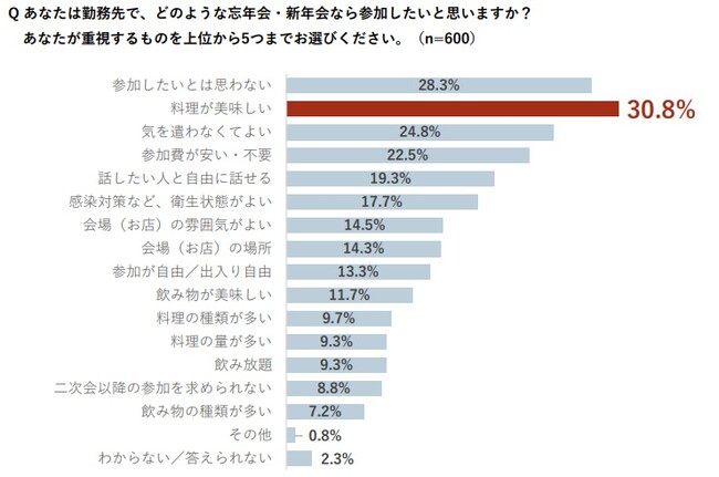 勤務先でどのような忘年会・新年会であれば参加したいかというアンケートでは、「料理が美味しい(30.8%)」がトップとなり、料理の内容が重視される結果が出ました。