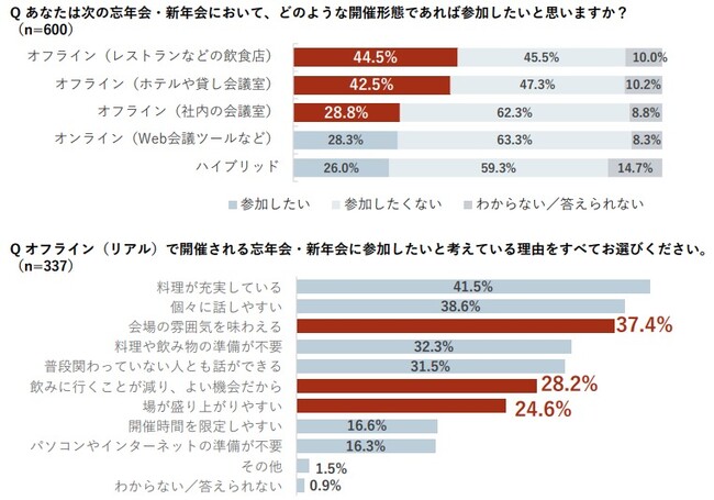 さらに、オフライン開催の忘年会・新年会に参加したい理由を尋ねたところ、料理の充実のみならず、オフライン開催特有の「個々に話しやすい(38.6%)」「会場の雰囲気を味わえる(37.4%)」「飲みに行くことが減り、良い機会だから(28.2%)」「場が盛り上がりやすい(24.6%)」といったコミュニケーションの観点も重視される傾向にありました。