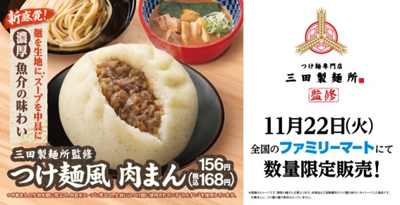 2022年11月22日(火)より、株式会社エムピーキッチン(代表取締役:村上竹彦)が運営する「つけ麺専門店 三田製麺所」の監修商品『三田製麺所監修 つけ麺風肉まん』(税込168円)を、全国のファミリーマートにて発売致します。生地は三田製麺所自慢の極太麺に、中具は濃厚豚骨魚介スープに見立てた“新感覚”の肉まん。数量限定の販売となっておりますのでこの機会に是非ご体感下さい。