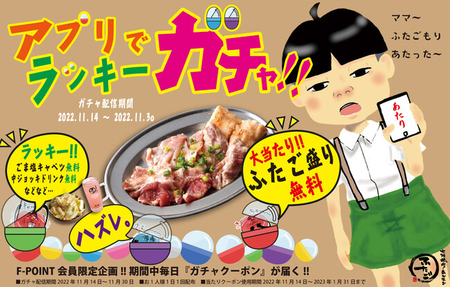 「大阪焼肉・ホルモン ふたご」では期間限定でF-POINTアプリで毎日チャレンジできるラッキーガチャを配信中。人気メニューが当たるチャンスです!F-POINTアプリをまだダウンロードしていない方はすぐにご登録をおすすめします!