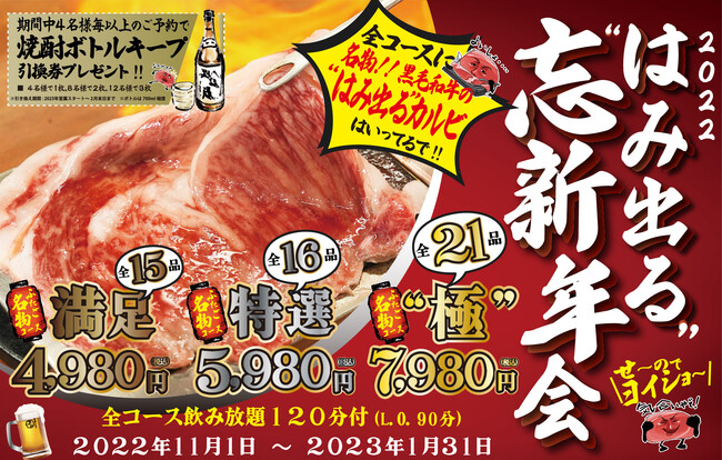 今年の忘新年会コースは超お得!2時間飲み放題の全コースに、“名物!!黒毛和牛のはみ出るカルビ”が入っています!更に、忘新年会が終わった後もお得になる“はみ出る”特典付き。忘新年会コースご利用4名様ごとに焼酎ボトル引換券をプレゼント!忘新年会が終わった後は、お財布に優しくボトルキープ(水割りで約12杯分)ができます!