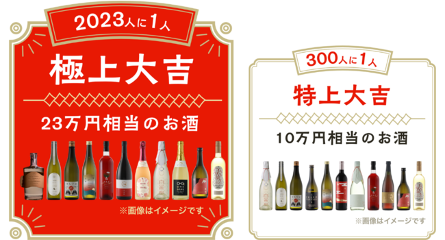 「酒ガチャ福袋 2023」をご購入者を対象に豪華景品が当たる抽選キャンペーンです。中でも注目は「極上大吉」です。23万円相当のお酒詰め合わせが、2023人に1人の確率で当選します。エントリー不要で、「酒ガチャ福袋 2023」のすべてのプランをご購入いただいた方が対象となります。
