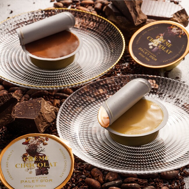 「クレームショコラ」は、カカオの味わいをご堪能いただけるよう、試行錯誤の末に誕生したカップデザート。ビターミルクは、ショコラティエ パレ ド オールが取り扱う幾多のカカオ豆の中から厳選したトリニダード・トバゴ産の上質なカカオ豆をメインにブレンドし、濃厚でなめらかな口どけに仕上げました。ミルキーホワイトは、自社でカカオ豆の選別・焙煎・搾油から手掛けて作った、自家製ホワイトチョコレートを使用してクリーミーな食感と、やさしいミルクの甘みの奥に広がるカカオの香りを活かした味わいに。オンラインショップを含む全店舗で好評発売中です。カカオ豆から手掛けるショコラティエならではの味わいをお楽しみください。