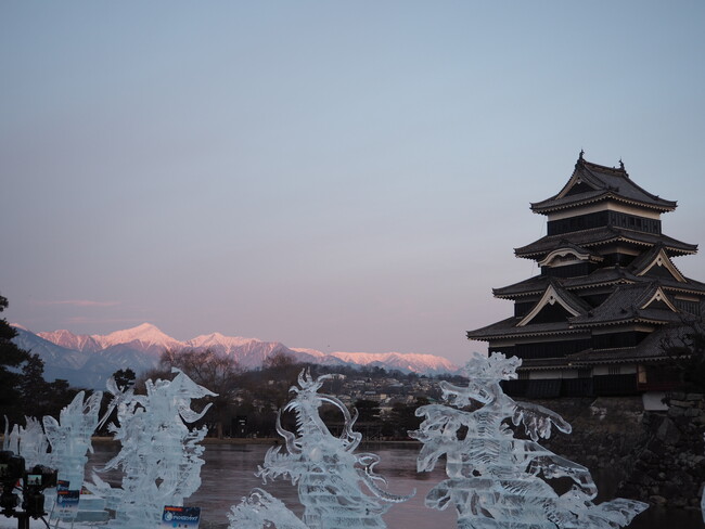 12月から2月の3カ月間は松本城レーザーマッピング「松本城~氷晶きらめく水鏡~」をはじめ、市街地イルミネーションで街が彩られます。そして、1月下旬には「国宝松本城氷彫フェスティバル」で城と冠雪の北アルプスを背景に瞬間の芸術・氷像が出現。この冬、光と氷の幻想的で壮麗な世界が信州・松本に広がります。