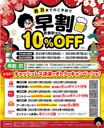 株式会社モンテローザ(本社:東京都杉並区、代表取締役:大神輝博)は、2022年11月20日(日)から、利用条件を満たして宴会コースをご予約いただくと、当日のお会計が10%OFFになる「早割キャンペーン」の受付を開始します。さらに、今回は「早割」のご利用の有無に関わらず、キャッシュレス決済サービスの各社キャンペーン期間中に、各社決済アプリや会員向けサイト上でキャンペーンにエントリーまたは事前にクーポンを取得し、当日キャッシュレス決済でお支払いされたお客様は、ご利用条件に応じて各社のポイント付与または当日のお会計が割引になるキャンペーンにご参加いただけます。是非この機会に、お得にご宴会をお楽しみください。