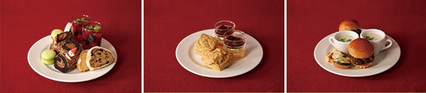 ホテル1階レストラン「ルボンヴィーヴル」で提供しているアフタヌーンティー、今回は、クリスマスを象徴する赤をメインカラーにした料理が並びます。
