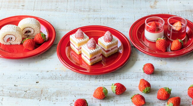 ホテルニューオータニ特製のシルキーなスポンジ生地が特徴で多くのファンを抱えるいちごスイーツの重鎮、『いちごショートケーキ』、ふんわりとしたロール生地でいちご・生クリーム・黒蜜あんこを包み、ルビーチョコレートを表面にあしらった和テイストの『いちごロール』、いちごのみずみずしい甘みとサクサクのパイ生地をお楽しみいただける『ナポレオンパイ』など、見た目も可愛らしいミニサイズのいちごスイーツをお好きなだけお楽しみいただけます。