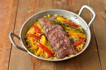 常陸牛の赤身をミディアムレアで焼き上げたステーキは絶品。旨味が凝縮されたステーキを豪華に盛りつけたお肉たっぷりの贅沢パエリア仕立て!