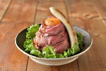 たっぷりと盛り込んだ常陸牛ローストビーフに、奥久慈卵の黄身をのせた肉肉TKG(卵かけ)丼。