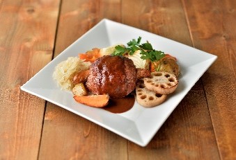 常陸の輝きソーセージに、たっぷりの常陸牛ひき肉を固め付けた原始人もびっくり?!すること間違いない夢のようなリッチなマンモス・ハンバーグ!