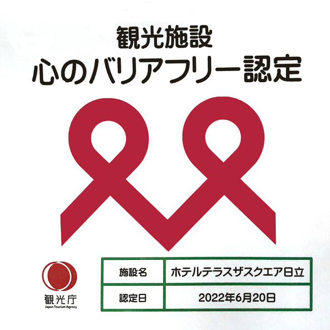 ホテルテラスザスクエア日立はバリアフリー対応や情報発信に積極的に取り組む姿勢のある観光施設を対象とした「観光施設における心のバリアフリー認定制度」の認定を得た宿泊施設です。ご高齢の方や障害のある方がより安全で快適な旅行をするための環境整備に努めております。