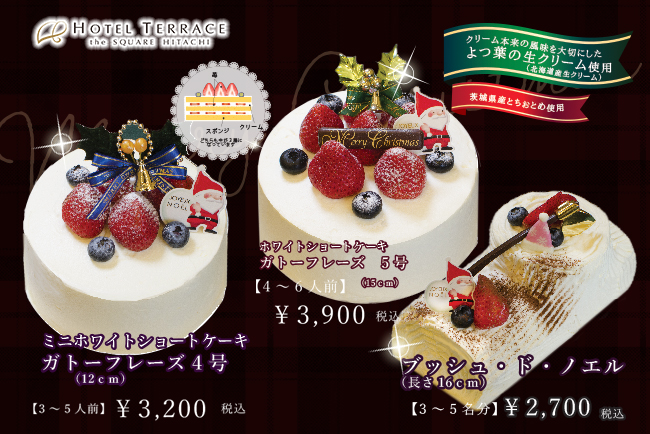 ケーキはそれぞれ、クリーム本来の風味を大切にした「よつ葉の生クリーム」と、茨城県産イチゴ「とちおとめ」を使っております。