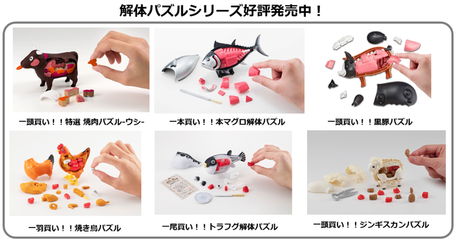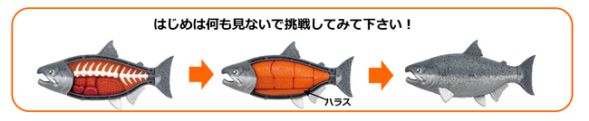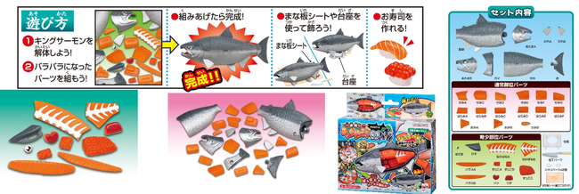 株式会社メガハウス(バンダイナムコグループ、代表取締役社長:佐藤明宏/東京都台東区)は、遊んで学べる立体パズル『解体パズル』シリーズの新商品「一本買い!!キングサーモン解体パズル」を2022年11月下旬に発売致します。 『解体パズル』シリーズは、遊びながら食材の部位を学べる立体型のパズルで、実物とほぼ同じ位置に各パーツが並んでおり、部位の名称と位置が一目瞭然でわかります。パーツを組み立てるパズル本来の遊びはもちろん、「飾っても可愛い」「部位の場所と形がわかって勉強になる」「パーツに部位名が書かれてあるのが良い」「子供から大人まで楽しめる」等、幅広い年代の方から、さらには国内外から好評を得ております。 「一本買い!!キングサーモン解体パズル」は、キングサーモンの部位がわかる立体パズルです。全34パーツの構成で、“はらみ”等のお馴染みの部位から“ハラス”や“すじこ”の希少部位パーツもあります。部位を組み合わるパズルとして遊ぶのはもちろん、包丁で解体したり、付属のシャリパーツに“すじこ”や“せみ”をのせてお寿司作り、まな板シートや台座で飾ることもできます。